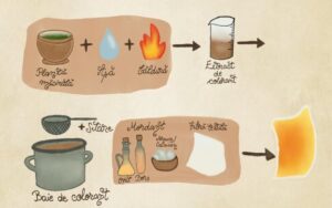 În funcție de rețetă, fierberea materialului vegetal poate dura de la 30 minute până la 1-2 ore. Colorantul se transvazează, prin sitare, într-un ulcior( sau un vas opac). Dacă fibra nu a fost deja mordansată, se poate aditiva mordantul direct în soluție. Această acțiune era denumită ca împietrire a culorii.