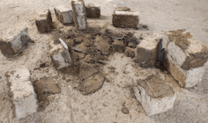 Cărămizi de chirpici după uscare. În centru: prelucrarea amestecului
