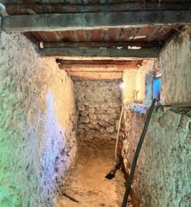 Zidărie de chirpici în faza de tencuire. Tencuire cu amestec de var cu nisip. Tâmplărie de lemn.